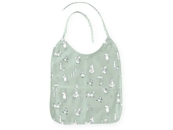 Suloinen vaaleanvihreä ruokalappu lasten ruokahetkiin. Ruokalapussa seikkailee Muumimaailman eri hahmoja.