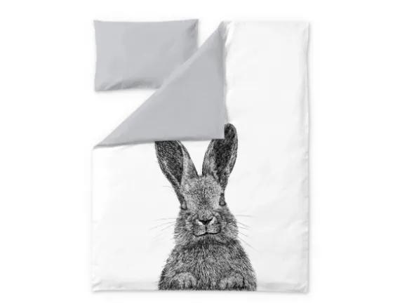 Finlayson Pupu -pussilakanasetti on kaksipuoleinen: toisella puolella on Pupu-kuosi ja toisella puolella pelkka kaunis rauhoittava harmaa. Lastensetin tyynyliina on samaa sävyä pussilakanan toisen puolen kanssa.