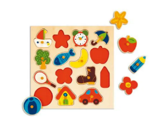 Selkeä ja kaunis puinen nuppipalapeli, jota koristavat 15 iloisen väristä kuvahahmoa. Palapelin koko on 28×28 cm.