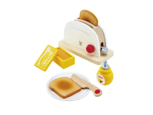 Puinen leivänpaahdin, josta leivät pompahtavat ylös. Pakettiin sisältyy hunajapurkki, kaksi leipäpalaa, voita, lautanen sekä veitsi.