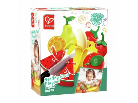 Turvalliset ja myrkyttömät Hape Terveelliset hedelmät kannustavat lasta hyviin ruokailutottumuksiin. Paketti sisältää mansikoita, päärynän, appelsiinin, melonilohkon, banaanin ja puisen leikkiveitsen. Banaanin voi kuoria niin kuin oikeankin, omenassa, päärynässä, appelsiinissa ja mansikoissa on irroitettavat varret. Leikkiveitsellä voit pilkkoa päärynän, appelsiinin, omenan ja melonin.