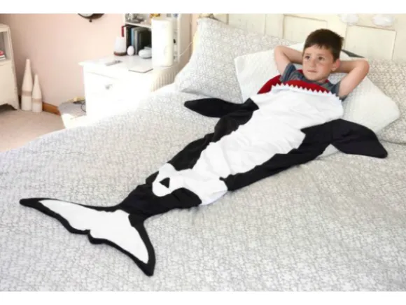 Tämä peitto ei olekaan ihan tavallinen. Peitto on muotoiltu miekkavalaan muotoiseksi ja sen sisään mennään valaan suuaukosta. Leiki valaan saalista tai vain löhöile. Tuotteen ikäsuositus peiton koon puolesta on 0-12 vuotta.