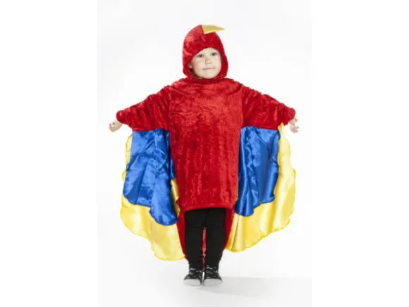 Papukaijana pääset matkimaan muita tekemällä hassuja ääniä tai viheltelemällä. Papukaijat ovat myös tarkkoja kuuntelemaan muita. Papukaija-asu on värikäs, puolipitkä ja hupullinen kokoasu, jossa isot siivet viimeistelevät asun. Materiaalina on käytetty ohutta, mutta kestävää loimusamettia ja siipiin asustesatiinia. Voit leikkiä asussa huoletta myös ulkona, koska materiaalit ovat pestäviä. Asu soveltuu 3-8-vuotiaille.