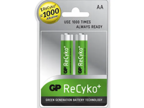 Pakkaus sisältää 2 kappaletta ladattavia AA-paristoja, jotka sopivat GP Recyko-laturiin. Paristoja voi ladata peräti 1000 kertaa.