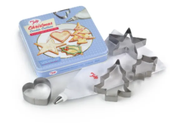 Tästä lähtee piparileipurin ykkösapuvälinesetti. Löytyy muotit, tylla ja koristelupursotin. Tuotteet on pakattu kauniiseen peltirasiaan.